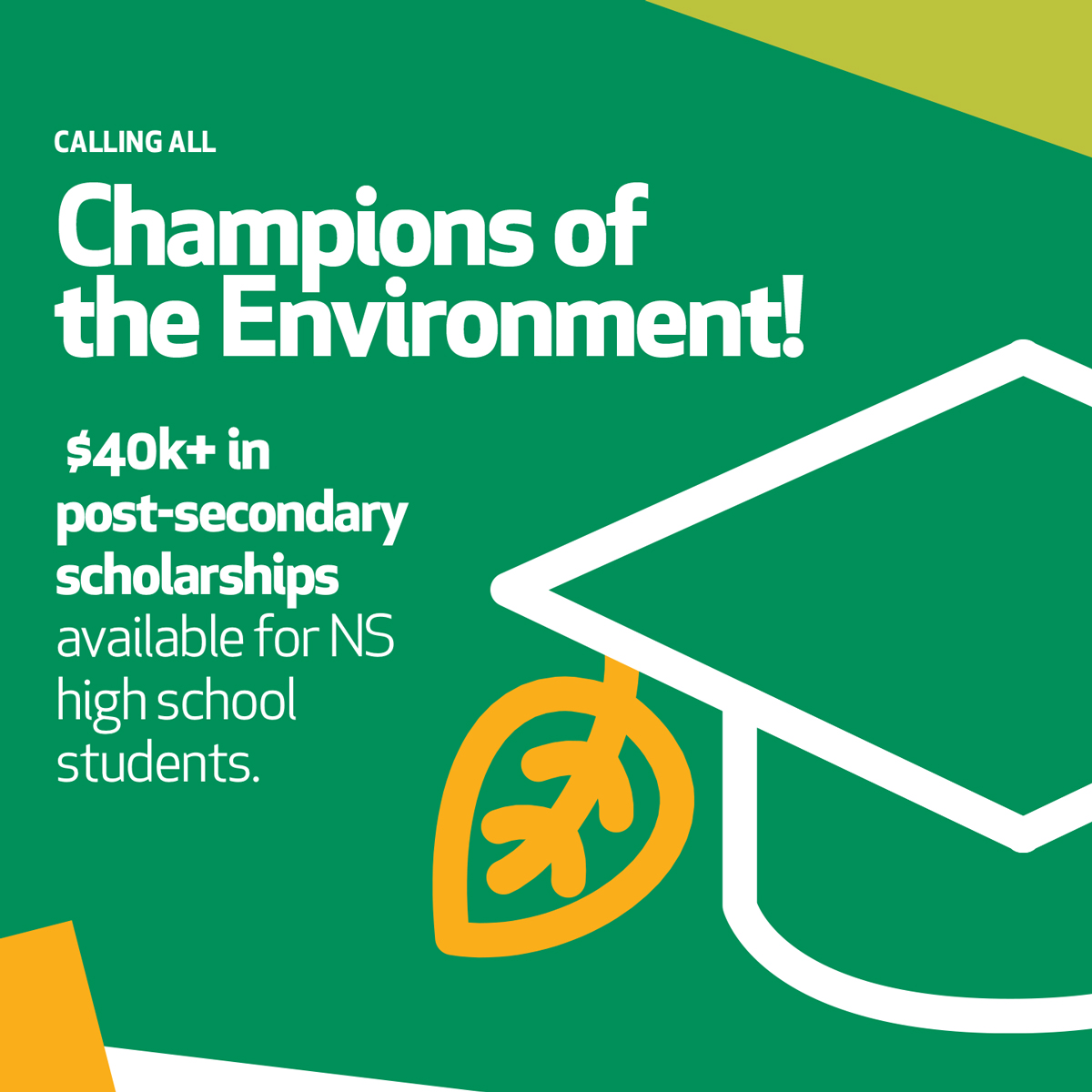 Divert NS is offering up to $40,500 in scholarships to Nova Scotia Grade 12 students who are making a difference for the environment. Eighteen (18) scholarships are available for 2026, valued at $1,000 and $3,500. Dedicated scholarships are also available for students who apply in French, as well as for Indigenous and Black Nova Scotian students.